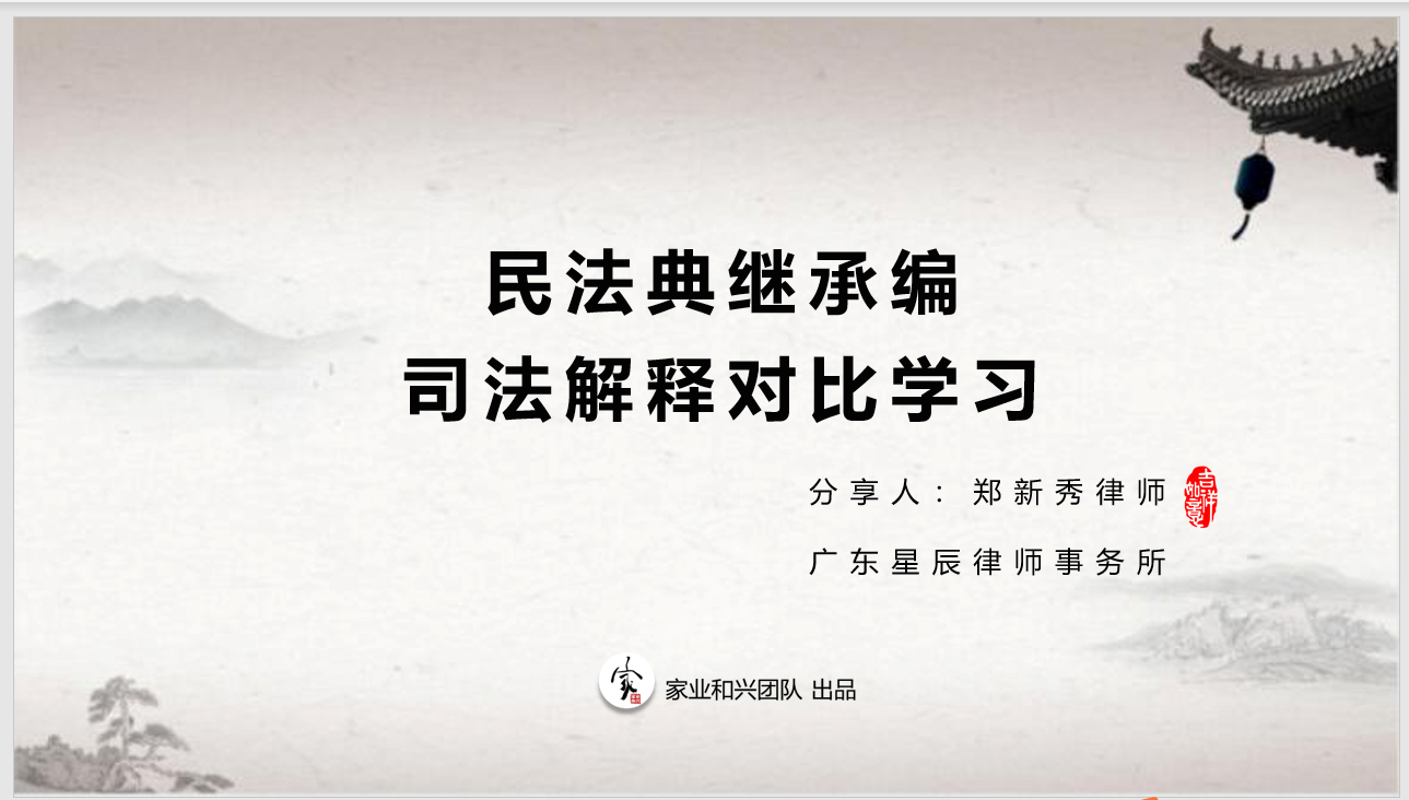 本所郑新秀律师作为律所家业和兴团队发起人,根据《民法典》继承编及其他编相关内容并结合多年执业经验,就适用《民法典》继承编司法解释(一)的条款逐一进行了解读和分享交流。