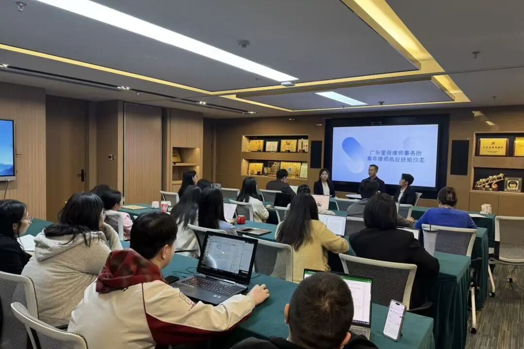 2025年11月20日晚上,为助力青年律师成长,搭建交流学习平台,由广东星辰律师事务所青年律师工作委员会主办的新一期星辰沙龙活动在24楼大会议室顺利举行。本期活动邀请所内优秀青年律师赖俊律师、郑新秀律师、刘玥律师针对案源拓展、专业技能提升等青年律师普遍关心的核心问题展开分享,吸引了众多青年律师到场参与,现场交流氛围浓厚,反响热烈。