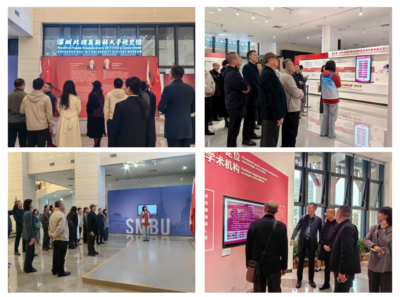 活动在庄严而温馨的氛围中拉开序幕。三方成员齐聚深圳北理莫斯科大学,共同参观了校史馆。在该校学生讲解员的引导下,大家深入了解了学校作为中俄两国教育合作典范的发展历程、办学理念与重要成就。校史馆通过丰富的图文展板、实物模型及多媒体互动,生动展现了学校自创立以来在人才培养、科研创新、文化交流等方面的突出贡献,特别是在服务国家战略、促进中俄友好方面发挥的独特作用,大家深刻感受到新时代教育国际化与党建融合发展的生动实践。