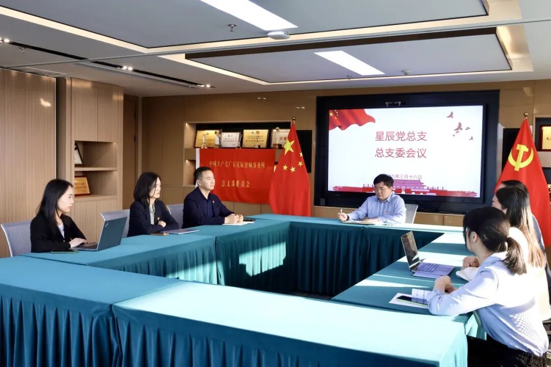 2026年3月16日下午,星辰党总支组织召开了总支委会议。星辰党总支书记楼洪,副书记林清源、赖俊,党总支委员万暄予、乔霞、王明琬、付学理参会。会议首先由党总支书记楼洪组织“第一议题”学习,带领与会人员深入学习“树立和践行正确政绩观”,并结合《政府工作报告》与《最高人民法院工作报告》开展了研读。随后,与会委员围绕2026年党建工作计划开展热烈讨论,一致表示要以党建促所建,推动党建工作与律所发展深度融合。