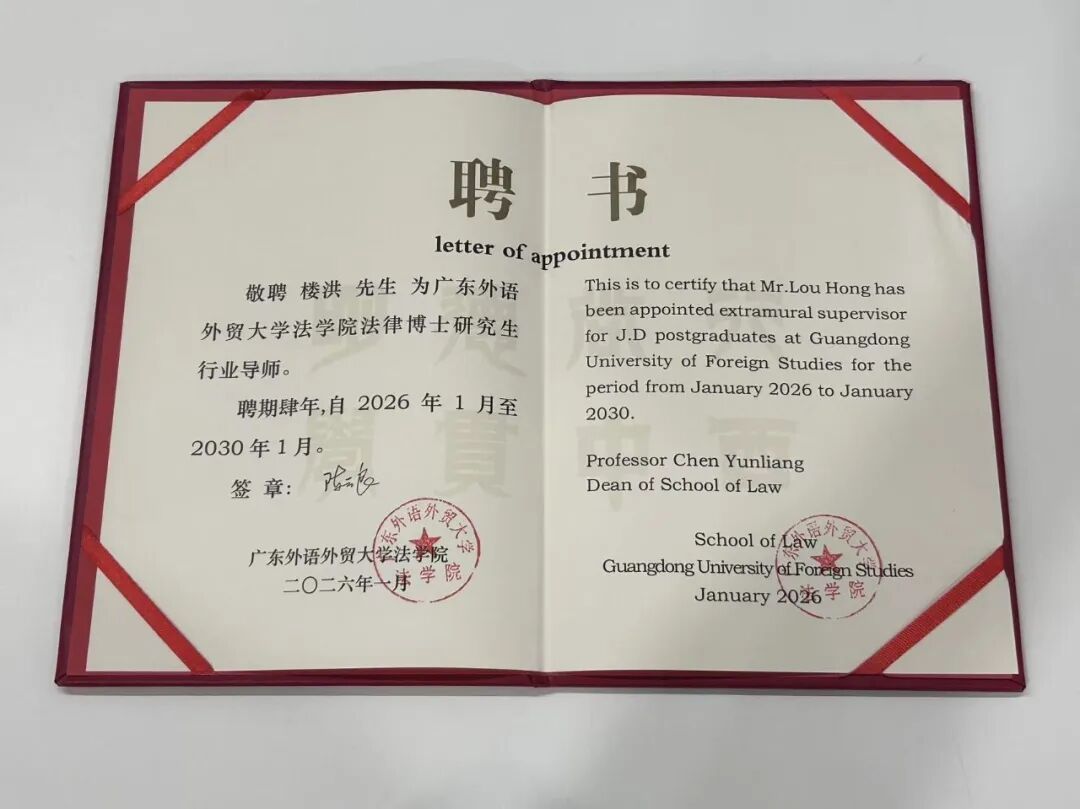 近日,广东星辰律师事务所党总支书记、高级合伙人楼洪博士获聘为广东外语外贸大学法学院法律博士研究生行业导师,聘期为2026年1月至2030年1月。